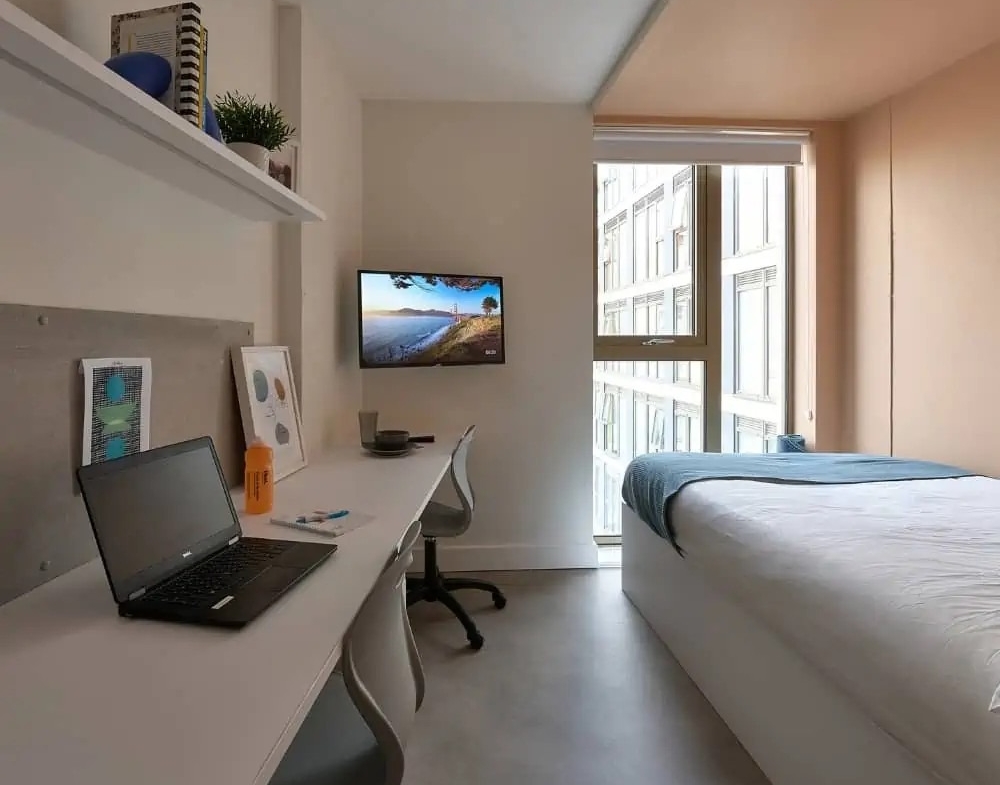 The Gold Studio offers from 17.5m² of private living space designed with comfort and practicality in mind. It features a 3/4 double bed, wardrobe, bedside shelf, drawers, coat hooks, and underbed storage. The study area includes a large desk, chair, bookshelves, and a noticeboard.