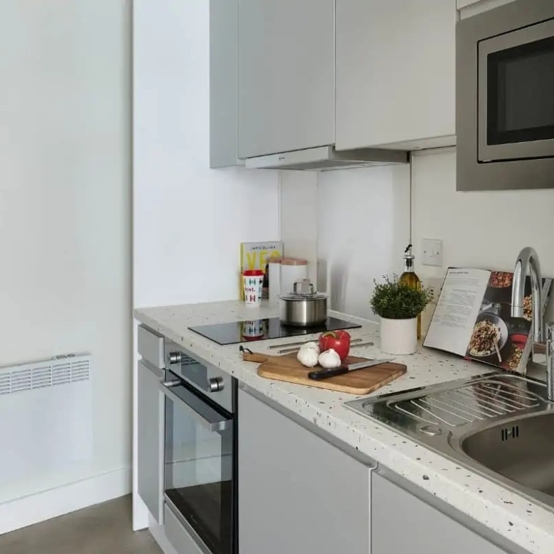 The en-suite bathroom and private open-plan kitchen come fully equipped with an oven, hob, fridge/freezer, microwave, toaster, and kettle. A breakfast bar with a chair provides a convenient dining spot.