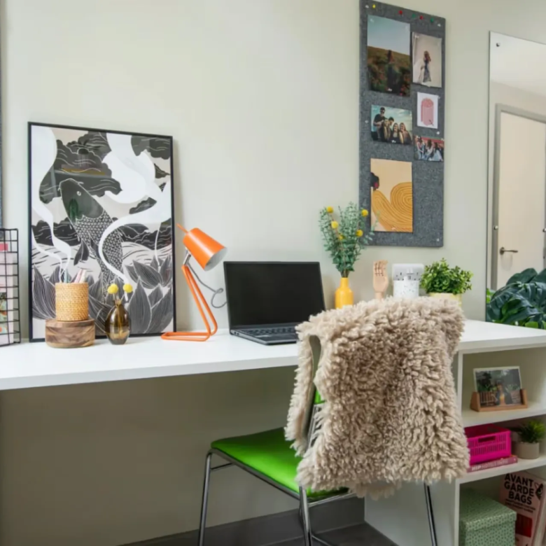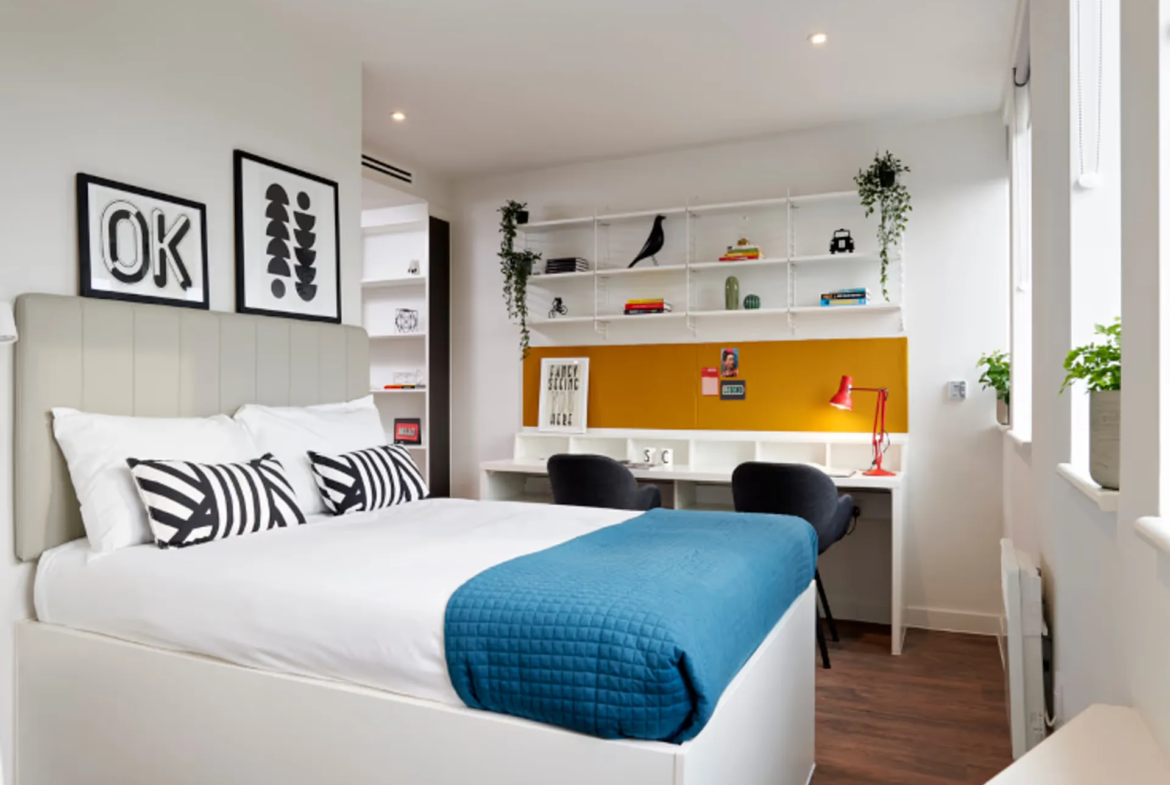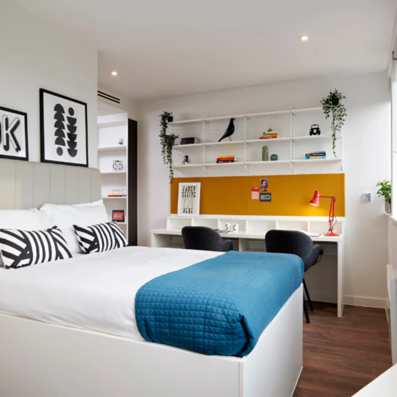 The Palin Ensuite with AC offers a stylish and private space featuring a double bed, study desk with chair, and wardrobe. Enjoy your own ensuite bathroom with a shower, toilet, and washbasin, plus access to a shared kitchen for cooking and socializing. With air conditioning for year-round comfort, it’s the ideal choice for students seeking modern, convenient living.