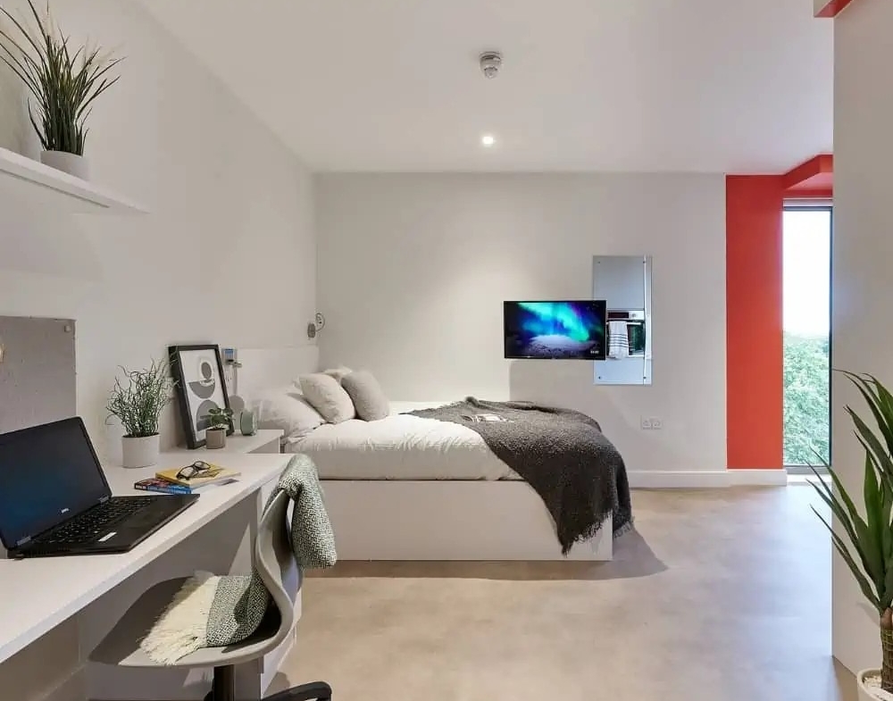 The Platinum Studio offers from 21.5m² of spacious private living space, thoughtfully designed to balance comfort and functionality. Each studio features a 3/4 double bed, wardrobe, bedside shelf, drawers, coat hooks, and underbed storage for ample storage options.