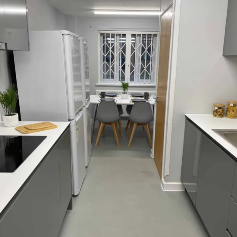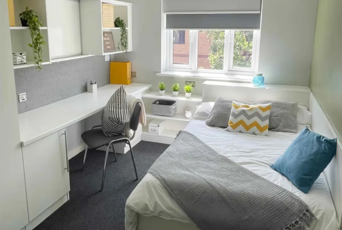 The Premium Non-Ensuite room offers a generous and comfortable student living space featuring small double bed, study desk with chair, wardrobe, shelves, and ample storage space, creating an organised environment ideal for both focused study sessions. Your bathroom will be shared equipped with a shower, toilet, washbasin, and mirror, giving you complete privacy and convenience for your daily routine. You’ll also have access to a shared kitchen, equipped with essential appliances including a fridge, cooking facilities, and storage cupboards perfect for preparing meals and socialising with fellow residents.