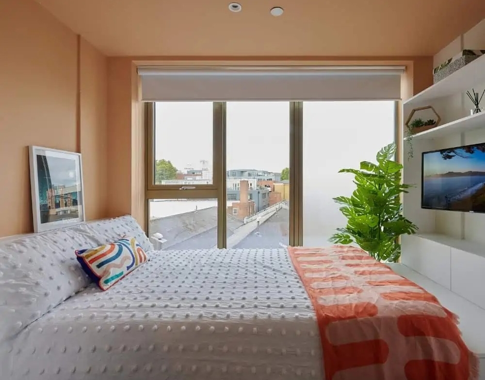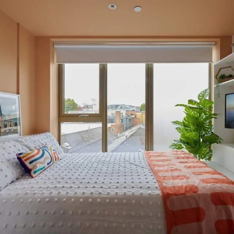 The Silver Studio offers from 16.5m² of private living space, designed for comfort and efficiency. It includes a 3/4 double bed, wardrobe, bedside shelf, drawers, coat hooks, and underbed storage. The study area features a large desk, chair, bookshelves, and a noticeboard.