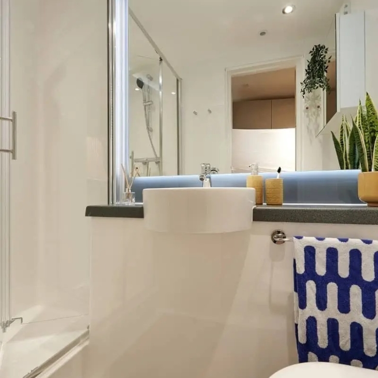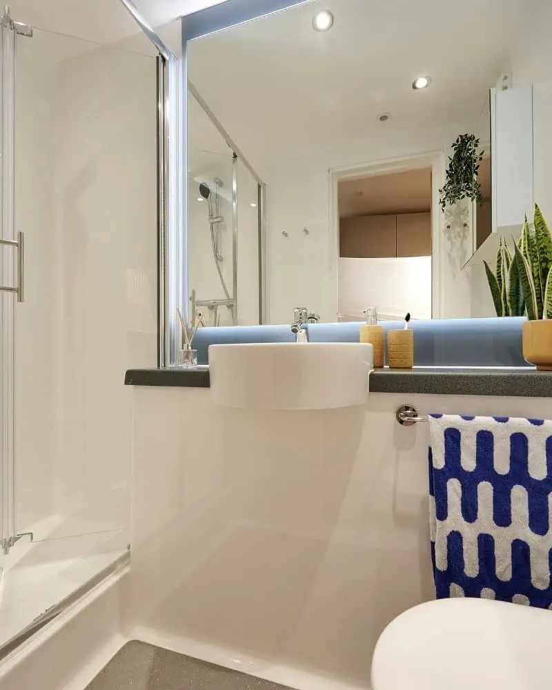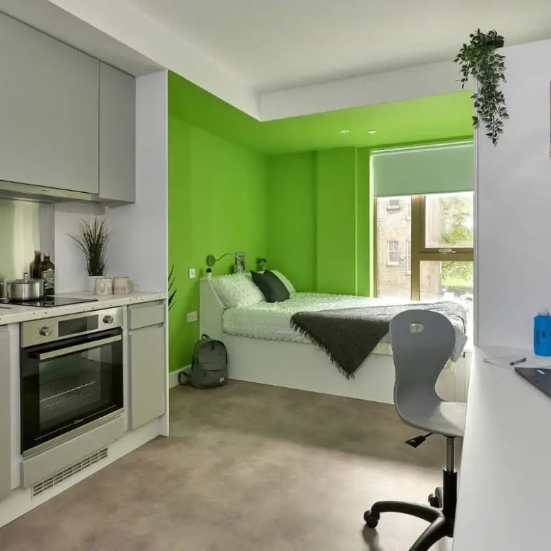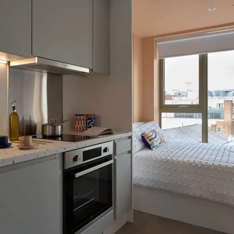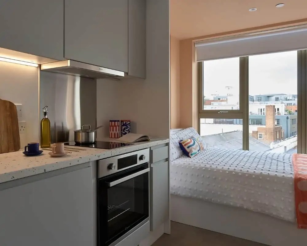 The en-suite bathroom and private open-plan kitchen come fully equipped with an oven, hob, fridge/freezer, microwave, toaster, and kettle. A breakfast bar with a chair offers a convenient dining space.